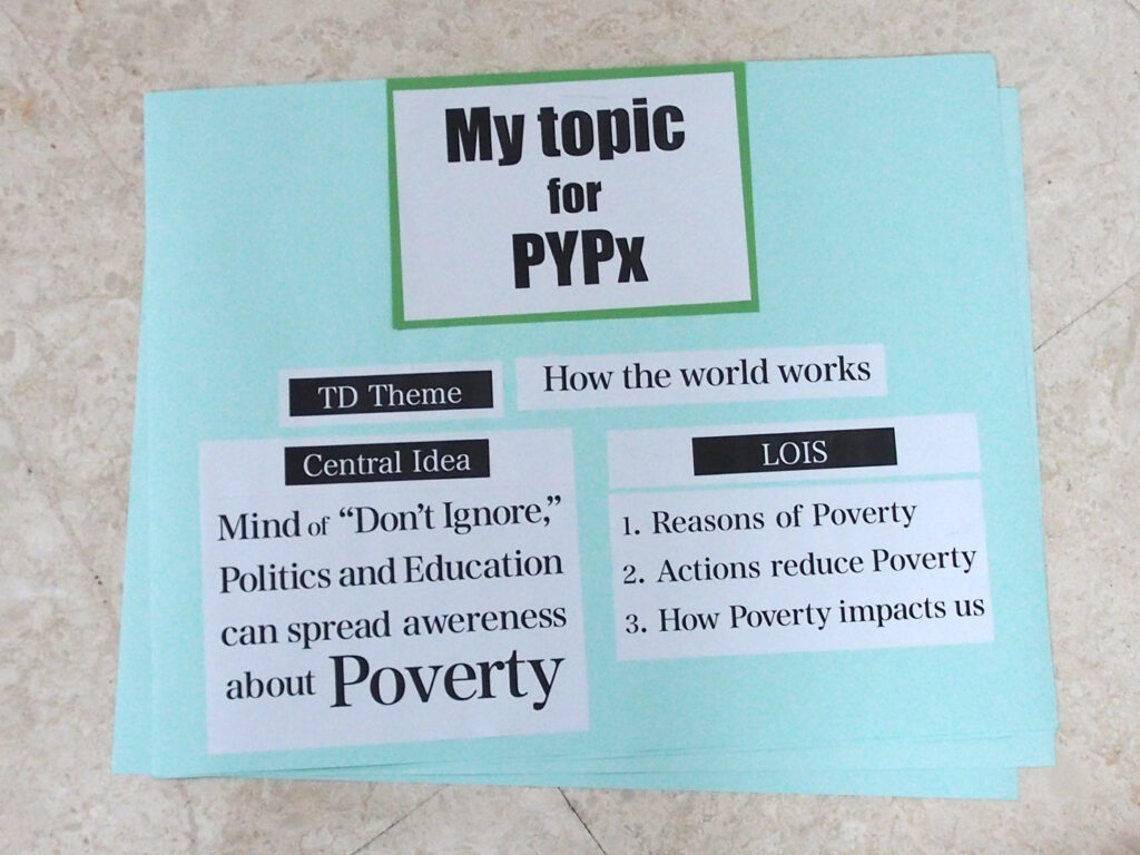 私は今まで貧困について考えたことがありませんでした。なぜなら日本の貧困は表沙汰にはなかなかならず、日本にいた時には貧困について考える機会もありませんでした。私はこのPYP Exhibitionで調べていて日本にも貧困があるということを知りました。